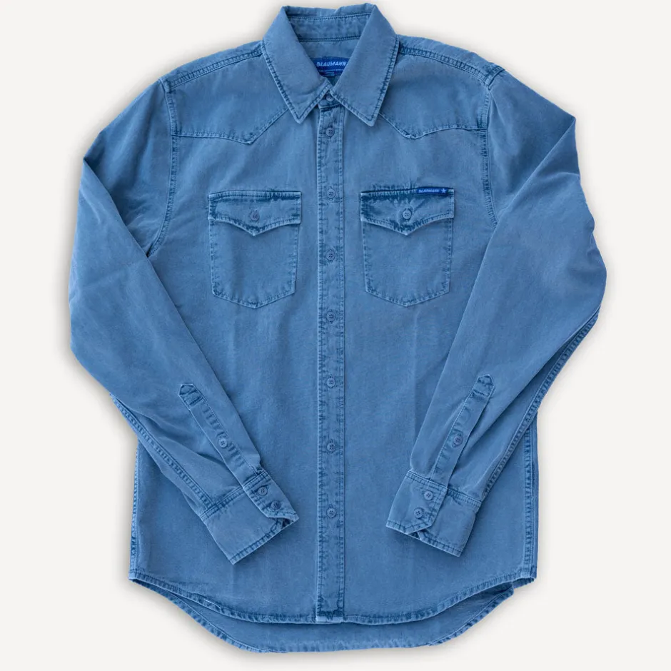 Neues Blaumann Hemd in taillierter, schmaler Passform mit zwei geknöpften Brusttaschen. Das ursprünglich naturfarbene Hemd wird bei einem deutschen Spezialisten gefärbt und gewaschen, um die einzigartigen Farbeffekte zu erzeugen. Der Stoff und alle anderen Materialien kommen komplett aus Deutschland und auch der komplette Produktionsprozess findet hier statt. Die Qualität des Stoffes ist schwer und griffig.