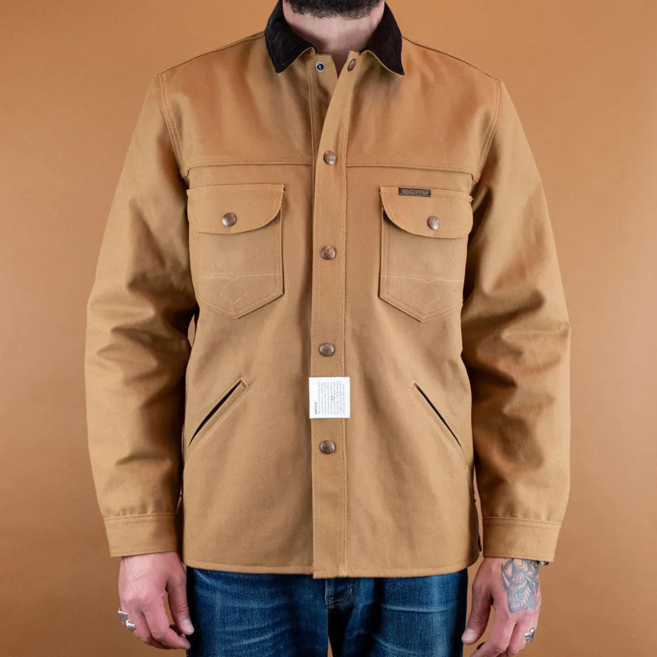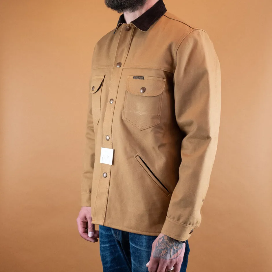 Jacke mit geradem Saum aus Smithson Canvas 13oz. von Indigofera. Mit klassischem Baumwoll-Deckenfutter im Western-Stil, Kordkragen und Messing-Druckknopfverschluss mit Indigofera-Logo. Abgerundet mit zwei aufgesetzten Brusttaschen und zwei Handwärmertaschen.