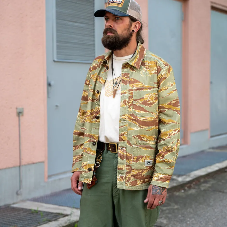 Inspiriert von der legendären P41 Utility-Jacke, die von den US-Marines während der Pazifikkampagnen des Zweiten Weltkriegs bis zur Landung in Inchon während des Koreakrieges getragen wurde. Sie ist ungefüttert und verfügt über vier Vordertaschen. Der gewählte Stoff ist ein Herringbone Twill.