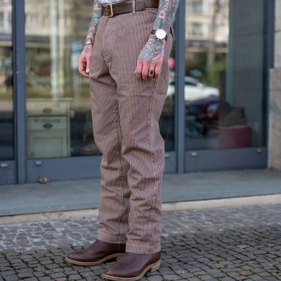 Diese klassische Chino wurde aus Stoff der Firma Kindermann gefertigt. Kindermann ist ein deutscher Spezialist für die Fertigung von Arbeitskleidung seit 1885. Die Hose ist strapazierfähig und sehr lässig. Sie besitzt 2 Gesäßtaschen mit Klappen zum Knöpfen und eine Knopfleiste in der Front mit Steinnussknöpfen. Der Bund ist mittelhoch und das Bein läuft gerade nach unten.